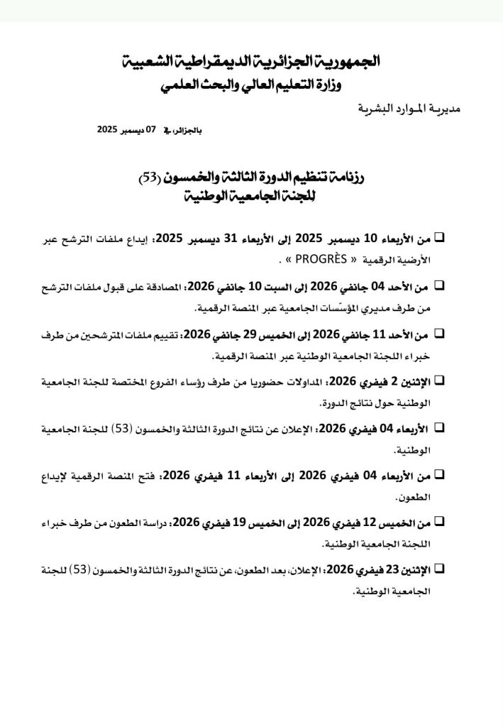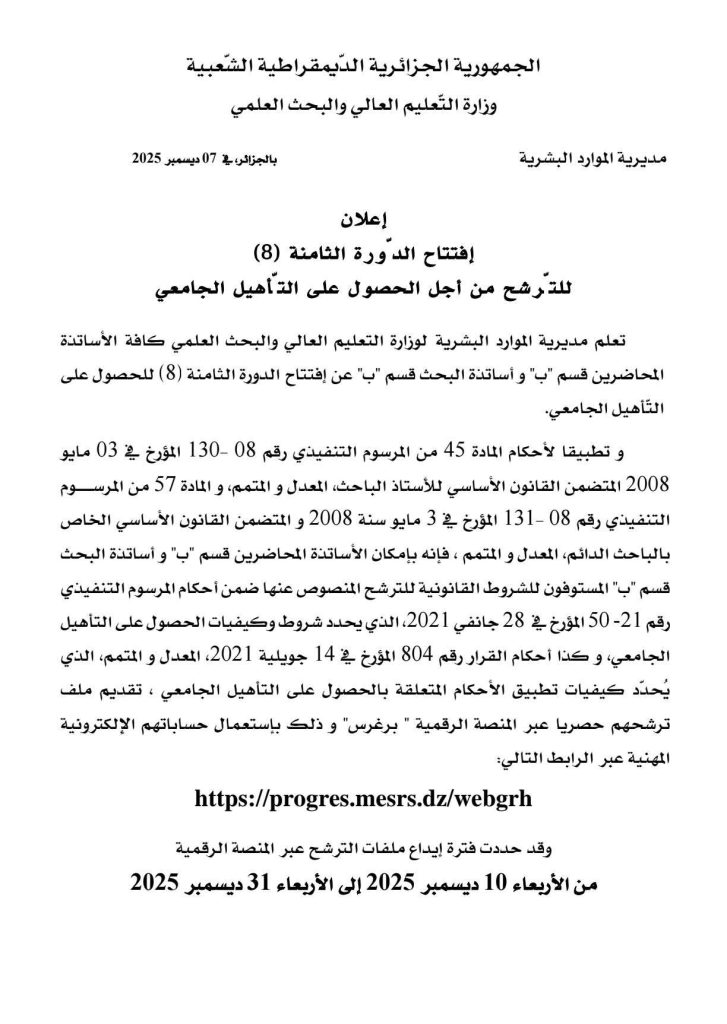 تبعاً لإعلاني مديرية الموارد البشرية لوزارة التعليم العالي والبحث العلمي المتضمّنان افتتاح الدّورة الثامنة (08) للتّرشح من أجل الحصول على التّأهيل الجامعي، والدّورة الثالثة والخمسون (53) لِلّجنَة الجـامعية الوطنية للتّرشح من أجل الحصول على رتبة أستـــــــاذ، تعلـــم المديرية المســـاعدة لما بعد التدرّج والبحث العلـــمي والعلاقات الخارجية بالمركز الجـــامعي، كافة الأساتذة المستوفين للشروط القانونية للترشح المنصوص عنها، على أن تقديم ملف ترشحهم سيكون حصريا عبر المنصة الرقمية PROGRES، و ذلك باستعمال حساباتهم الإلكترونية المهنية عبر الرابط التالي: