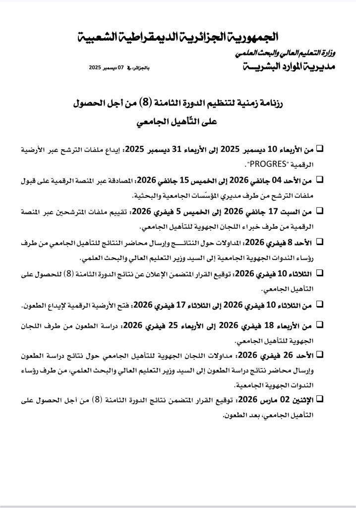 من جـــانب آخر، تعلن المديرية المســـاعدة لما بعد التدرّج والبحث العلـــمي والعلاقات الخارجية، على أنه قد تمّ تخصيـــص أرضيتين رقميّتين لإيـــداع الملف الإداري والبيداغوجي بالنسبة للتأهيل الجامعي، والملف الإداري بالنسبة للأستاذية للمترشّح(ة) من أجل المطـــابقة الإدارية والبيداغوجية (حسب الحالة) من طرف المؤسّسة، حيث يتم إيداع الملفات على هذه المنصّات في الفترة الممتدّة ما بين يوم الأربعاء 10 ديسمبر 2025 إلى غـــاية يوم الاثنين 29 ديسمبر 2025،